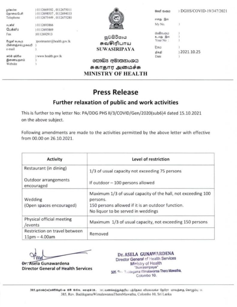 இன்று நள்ளிரவு முதல் அமுலாகும் வகையில் மேலும் சில தளர்வுகளை சுகாதார அமைச்சு அறிவித்துள்ளது. சுகாதார சேவைகள் பணிப்பாளர் நாயகம் டொக்டர் அசேல குணவர்தனவின் கையொப்பமிடப்பட்ட அறிக்கையிலேயே கீழ்க் குறிப்பிடப்பட்ட தளர்வுகள் அறிவிக்கப்பட்டுள்ளன திருமண மண்டபத்தின் மூன்றில் ஒரு பங்கு கொள்ளவில் 100 பேருக்கு மேற்படாமல் திருமண வைபவங்களில் கலந்து கொள்ளமுடியும்.