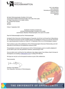 முன்னாள் ஜனாதிபதி ரணில் விக்ரமசிங்க மற்றும் அவரது மனைவி பேராசிரியர் மைத்ரி விக்ரமசிங்க ஆகியோருக்கு, 2023 செப்டம்பரில் லண்டன், வோல்வர்ஹாம்டன் பல்கலைக்கழகம் அனுப்பிய அழைப்பிதழின் நகலை ஐக்கிய தேசியக் கட்சி (UNP) அதிகாரப்பூர்வமாக வெளியிட்டுள்ளது.