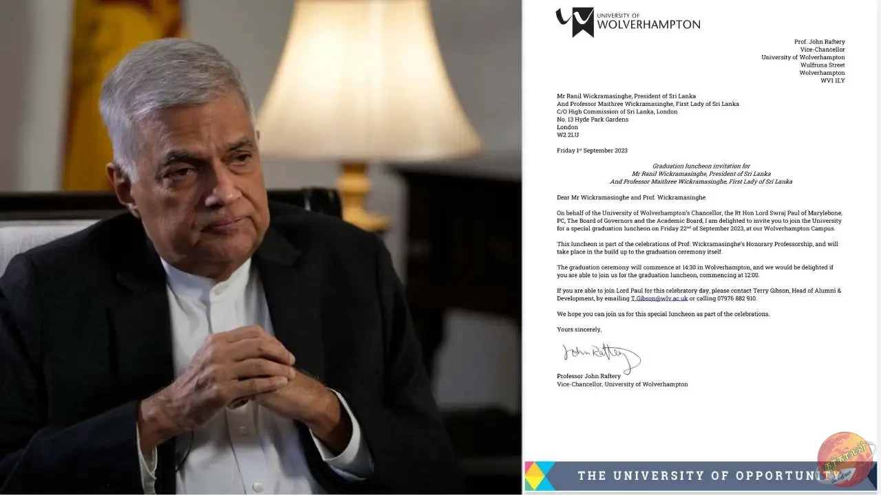 முன்னாள் ஜனாதிபதி ரணில் விக்ரமசிங்க மற்றும் அவரது மனைவி பேராசிரியர் மைத்ரி விக்ரமசிங்க ஆகியோருக்கு, 2023 செப்டம்பரில் லண்டன், வோல்வர்ஹாம்டன் பல்கலைக்கழகம் அனுப்பிய அழைப்பிதழின் நகலை ஐக்கிய தேசியக் கட்சி (UNP) அதிகாரப்பூர்வமாக வெளியிட்டுள்ளது.