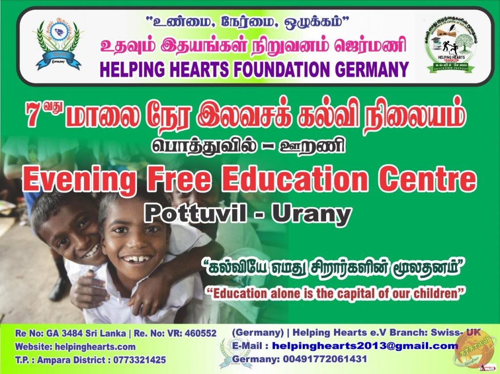 திட்டமிட்டு அளிப்பதற்கு கங்கணம் கட்டி செயல் படுகின்றார்கள். போதைவஸ்த்தினை எமது மாணவச் செல்வங்களை குறிவைத்து மரணத்தின் பிடியில் சிக்க முயற்சிக்கின்றார்கள் நம் பிள்ளைகள் மீது கவனம் செலுத்த வேண்டும். எமது பிள்ளைகளை நல் வழிப்படுத்துவதற்காக நாம் சிறு முயற்சி எடுத்து வருகின்றோம். எமது பிள்ளைகளின் எதிர் காலத்தினை கருத்தில் கொண்டு உதவும் இதயங்கள் நிறுவனத்தின் இலவச மாலை நேரக்கல்வி நிலையங்கள் மற்றும் அறநெறி வகுப்புக்களையும் ஆரம்பித்து வருகின்றோம். அந்த வகையில் இன்று 7 வது கல்வி நிலையமாக பொத்துவில் ஊறணி என்னும் கிராமத்தில் ஆரம்பித்து வைத்துள்ளோம்