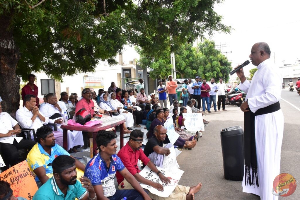குறித்த போராட்டத்தில் ஈடுபட்ட மக்கள் கருப்பு பட்டி அணிந்து போராட்டத்தை முன்னெடுத்து வருகின்றனர்.