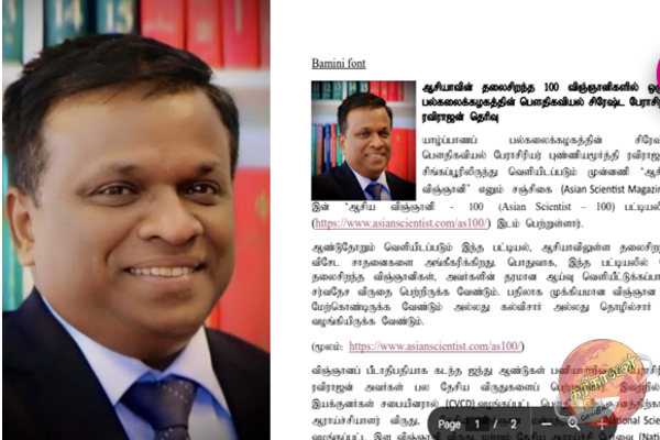 ஆசியாவின் தலைசிறந்த 100 விஞ்ஞானிகளில் ஒருவராக இவரின் பெயர் இடம்பெற்றுள்ளது யாழ்ப்பாண பல்கலைக்கழகம் மற்றும் தமிழர் சமூகத்திற்கே பெருமை சேர்க்கும் நிகழ்வாகும்.